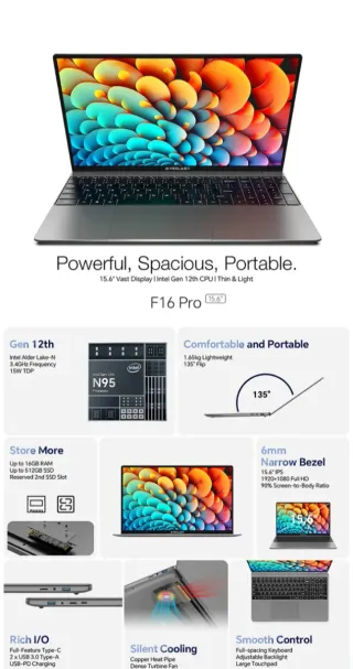 Nuovo, sigillato, pronto per l'uso, di dicembre 2025. Portatile Teclast F16 Pro con schermo da 15,6 pollici e processore Intel di 12ª generazione. È sottile e leggero, ideale da portare ovunque. - Windows 11 installato - Schermo IPS Full HD da 15,6 pollici (1920x1080). - Processore Intel Alder Lake-N N95 di 12ª Gen. - Frequenza di 3,4GHz e TDP di 15W. - 16GB di RAM e fino a 512GB SSD. - Slot aggiuntivo per SSD. - Cornice stretta da 6mm con rapporto schermo-corpo del 90%. - Peso leggero di 1,65kg. - Cerniera con apertura a 135°. - Porte: 1x USB-C (funzionalità completa), 2x USB-A 3.0, ricarica USB-PD. Preferibile consegna a mano