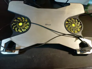 Base refrigerante portatile con due ventilatori per il tuo portatile. Design metallico argentato. Due ventilatori con pale gialle. Supporto regolabile per il portatile. Il supporto sinistro è fisso.
