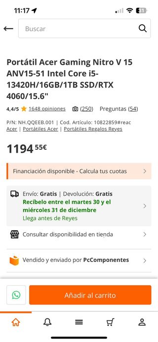 Vendo Acer Nitro V15 (ANV15-41) in condizioni impeccabili, acquistato 7 mesi fa. È come nuovo, senza un solo graffio, sempre molto curato. 🔹 Specifiche: Schermo 15,6” Full HD – 165 Hz Processore: AMD Ryzen 7 7735HS Grafica: NVIDIA GeForce RTX 4060 RAM: 16 GB DDR5 (4800 MT/s) Archiviazione: 1 TB SSD Sistema operativo Windows originale 🔹 Stato: Praticamente nuovo Nessun urto o graffio Funziona perfettamente 🔹 Include: Scatola originale Caricatore originale Fattura di MediaMarkt Garanzia in corso Ideale per: Gaming attuale Editing video e fotografico Programmazione e multitasking 📍 Consegna a mano o spedizione solo tramite Whallapop