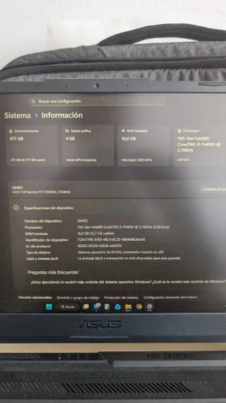 Portátil Asus TUF Gaming F15 con processore grafico GTX1650 da 4 GB vram, 16 GB di memoria RAM ddr4, 512 GB SSD e Intel Core i5-10300H (Viene con Windows 11). Consegno il laptop nella sua scatola originale insieme al caricatore. Ideale come primo laptop. Non presenta alcun difetto, funziona come il primo giorno.
