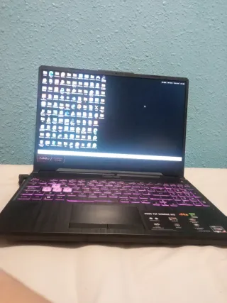 Portátil ASUS TUF Gaming F15 FX506HC in colore nero con dettagli viola. Piccoli segni d'uso, è il mio computer di lavoro e lo curo molto. Il cavo di alimentazione è americano perché l'ho comprato lì, ma può essere sostituito poiché è in due parti. Include l'adattatore. Ha adesivi =) - Schermo da 15,6 pollici 144Hz - Tastiera retroilluminata - Intel i5 11-400H - 16 GB di RAM espandibile - SSD M.2 NVMe 512 GB - Secondo slot per NVMe M.2 - Scheda video RTX 3050 4 GB. Prezzo negoziabile.