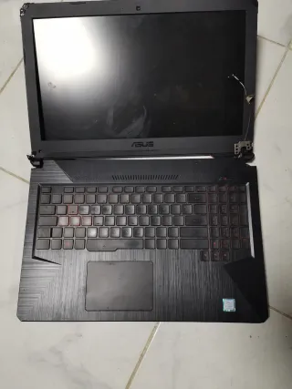 Portátil gaming Asus TUF FX504GN in colore nero con dettagli rossi. - Schermo da 15,6 pollici. - Tastiera retroilluminata. - Processore Intel Core i7. Si vende solo come mostrato nell'annuncio. Lo schermo è rotto, non ha né disco rigido né memoria. È possibile recuperare parti come la scocca, la tastiera e altro. Non conosco lo stato della scheda madre.