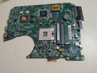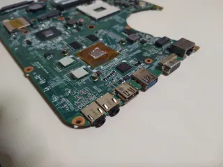 Scheda madre per portatile Toshiba L755. Componente principale della scheda. Connettore per memoria RAM. Connettore per disco rigido SATA. Batteria di backup dell'orologio. Il connettore grafico deve essere fissato bene per evitare guasti. Un modulo USB non funzionava, non so se per guasto del modulo o della scheda. Il processore si surriscaldava, non so se per colpa del processore o della scheda. Per il resto, la scheda funzionava perfettamente.