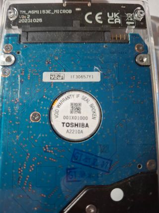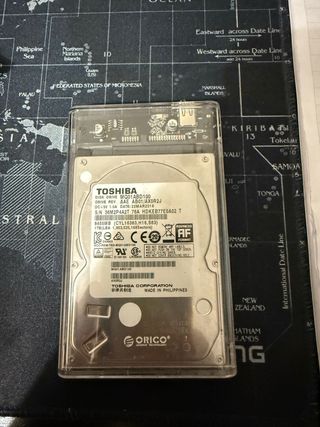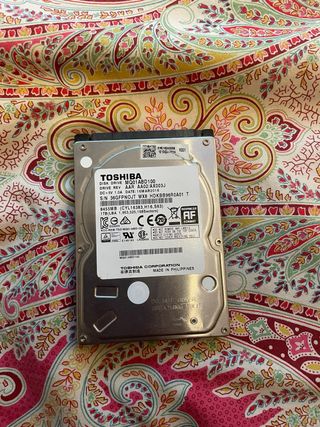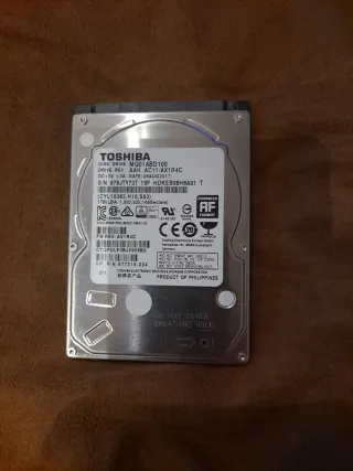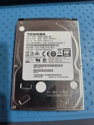 Disco rigido interno Toshiba da 1TB. Modello: MQ01ABD100. Capacità: 1TB (1.953.525.168 settori). Interfaccia: SATA. Prodotto nelle Filippine.
