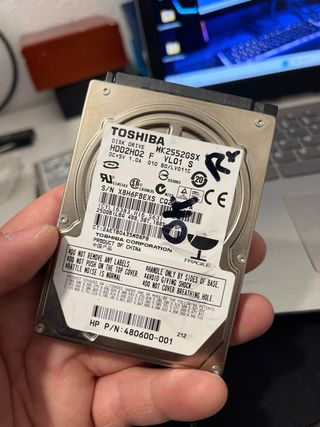Disco rigido esterno Toshiba da 2,5 pollici con una capacità di 250 GB. Ideale per archiviazione aggiuntiva. Modello: MK2552GSX. Firmware: LV011C. Numero di serie: X8H6FBEXS.