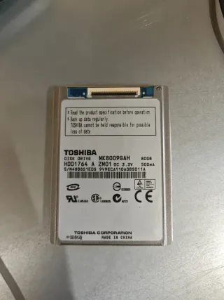 Disco rigido da 1,8 pollici con capacità di 80GB. - Modello: MK8009GAH - Tensione: 3,3V - Corrente: 500mA - Prodotto in Cina. Verificato, senza settori difettosi. Interfaccia CIF a nastro piatto, perfetto per iPod o portatile