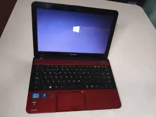 Portatile Toshiba con processore i5. Con cinquecento GB di disco rigido, uscita HDMI per collegarlo a una TV, lettore di schede SD, registratore sul lato, cavo e batteria che dura un paio d'ore. Colore nero e rosso. Schermo con sfondo blu. Tastiera completa.