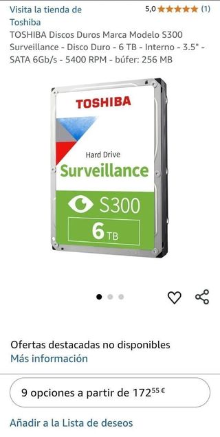Vendo disco rigido interno Toshiba S300 Surveillance da 6 TB. È in perfette condizioni. Capacità: 6 TB Interno 3,5' SATA 6Gb/s 5400 RPM Buffer: 256 MB