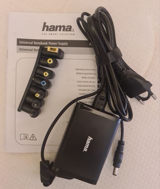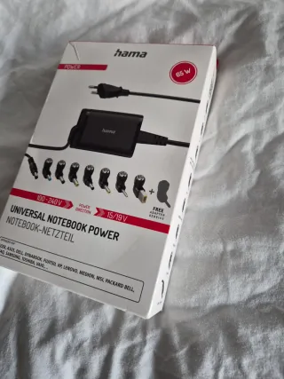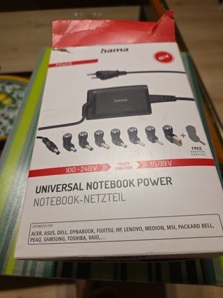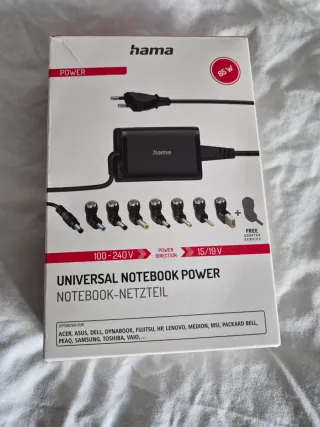 Vendo caricabatterie universale per laptop Hama da 65W. È in perfette condizioni. - Funziona con tensioni da 100-240V. - Potenza di 15/19V. - Include vari connettori per diversi portatili (Acer, Asus, Dell, Dynabook, Fujitsu, HP, Lenovo, Medion, MSI, Packard Bell, PEAQ, Samsung, Toshiba, Vaio...). - Privo di plastica.