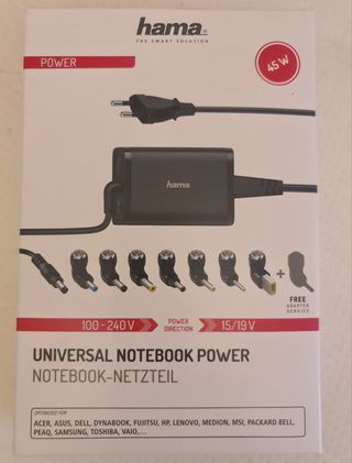 Adattatore di corrente universale Hama per laptop. Nuovo. - Potenza di 65W. - Tensione di uscita 15/19V. - Include connettori per diverse marche: HP, Lenovo, Dell, Asus, Acer, Samsung, Toshiba, Fujitsu, MSI, Dynabook, Medion. - Indicatore di direzione dell'energia.