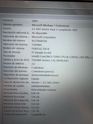 Toshiba Portégé Z30-B-113 Intel i5 5200U 2.0 GHz, schermo 13.3", 16 GB Ram, SSD 240 GB, Windows 11 Pro, segni d'uso, perfetto stato, include il caricatore originale, la batteria da sostituire, dura poco 10-15 min. Visualizzabile e testabile senza impegno. Consegna a Fuenlabrada.