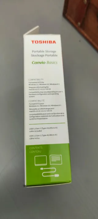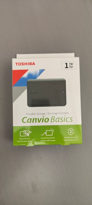 Hard disk esterno Toshiba Canvio Basics da 1TB, ideale per archiviare i tuoi dati. - Formattato NTFS per Windows 10/Windows 8.1. - Richiede riformattazione per macOS v10.15/v10.14/v10.13. - Include cavo USB 3.2 Gen 1 (Type-A to Micro-B). - Contenuto della confezione: Hard disk, cavo USB.