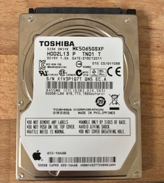 Disco duro interno Toshiba da 500GB. - Modello: MK5065GSXF - Capacità: 500GB - Interfaccia: SATA - Data di produzione: 31 Ottobre 2011 - Made in Philippines