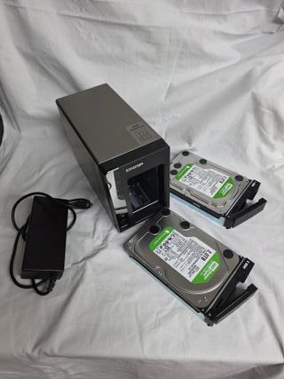 Network Attached Storage QNAP TS-219P+ con dos hard disk drive Western Digital da 2TB ciascuno. QNAP TS-219P+ 1.6GHz 512MB DDRIII 2xBay 3,5'' Nas Server - DISCHI INCLUSI - La NAS viene venduta come NON funzionante, si accende ma non si riesce a trovare sulla rete. I dischi inclusi sono da 2TB per un totale di 4 TB di spazio - NAS QNAP TS-219P+ - 2x Hard Disk Drive Western Digital da 2TB - Alimentatore incluso