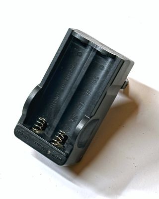 Caricabatterie per batterie al litio modello 18650. - Design compatto in plastica nera. - Molle per il contatto delle batterie.