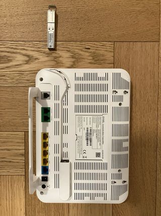Modem router per fibra. Oltre al modem, l'adattatore per l'ingresso della fibra per linea WindTre