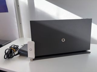 Modem router Vodafone Station con tecnología WiFi 6. Incluye adaptador de corriente y un dispositivo USB. - Diseño moderno y compacto. - Ideal para el hogar.