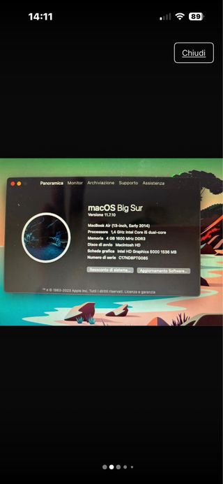 Un portatile Apple MacBook Air da 11 pollici in color argento. È un dispositivo compatto e leggero, ideale per chi cerca portabilità. Apple Mac Book Air 11" Vendo Mac Book Air 11 pollici del 2011 in buone condizioni esterne, tutto pienamente funzionante, gia' reinstallato rimane solo la configurazione iniziale con l'ID Apple e quant'altro. Il Mac funziona benissimo e monta come Mac OS il 10.8 Mountain Lion, picolo difetto in un angolo che non inificia assolutamente l'utilizzo, come si vede in foto. Fornito di Caricabatteria - Schermo da 11 pollici. - Design sottile e leggero.