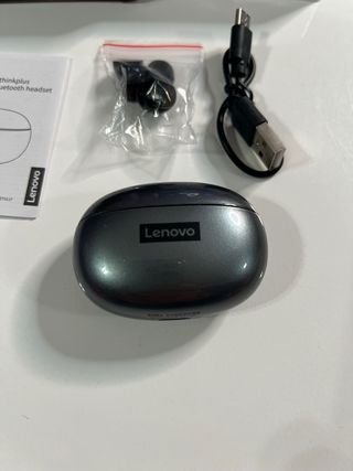 Auricolari wireless Lenovo XT88 in colore grigio. Includono la loro custodia di ricarica. Lenovo XT88 TWS auricolare wireless Bluetooth 5.3 doppio stereo riduzione del rumore controllo touch auricolari a lunga durata in modalità standby. - Custodia di ricarica compatta. - Cavo di ricarica USB. - Cuffie di ricambio.