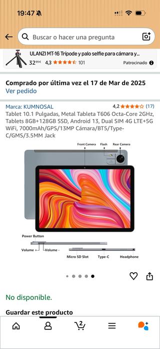 Tablet KUMNOSAL T606 da 10.1 pollici, completamente nuovo. Ideale per l'uso quotidiano. - Schermo da 10.1 pollici. - Processore Octa-Core 2GHz. - 8GB di RAM e 128GB di spazio di archiviazione SSD. - Android 13. - Dual SIM 4G LTE+5G WiFi. - Batteria da 7000mAh. - GPS integrato. - Fotocamera da 13MP. - Bluetooth 5. - Porta Type-C. - Jack da 3.5mm per cuffie.