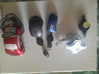 Vendo lotto di accessori informatici. - 4 mouse USB di varie forme e colori. - Cuffie con microfono. - Telecamera USB. - Adattatore di rete RJ-45.