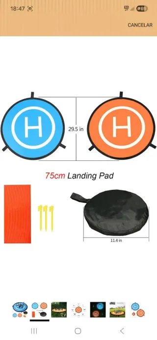 Tappetino di atterraggio pieghevole per droni. Totalmente nuovo, non utilizzato. Progettato per facilitare il decollo e l'atterraggio. Diametro 29 cm. Reversibile, colore arancione o blu. 3 picchetti per fissarlo al suolo inclusi. Adesivi riflettenti inclusi. Custodia inclusa.