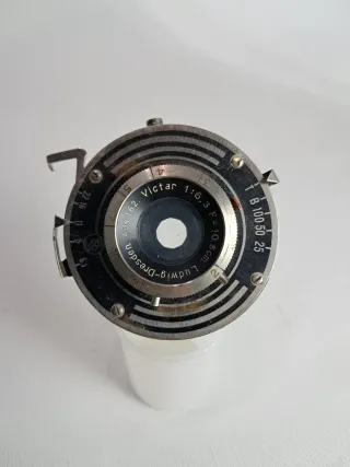Obiettivo Victar per soffietto. - Lunghezza focale: 10,5 cm. - Diaframma: 1:6,3. - Numero di serie: 434162. - Prodotto a Ludwig-Dresden.