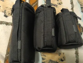 Set di tre porta obiettivi universali. - Materiale resistente e imbottito. - Chiusura con cerniera e moschettone - Design compatto.