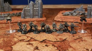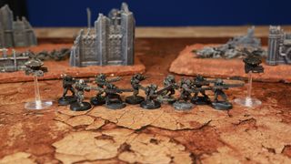 Games Workshop. Citadel. Warhammer 40.000. 10 Fire Warriors con droni tattici dell'Impero Tau (Team B). Miniature originali GW in plastica fuori produzione. Erano dipinte e sono state decolorate.