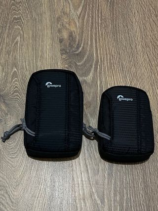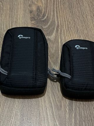 Due fodere protettive per fotocamere compatte. Colore nero. Chiusura con cordoncino. Logo del marchio visibile. 2 diverse dimensioni. Ogni fodera ha due scomparti.