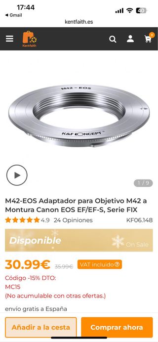 Adattatore per obiettivo M42 per montaggio Canon EOS EF/EF-S. Modello: KF06.148 Serie FIX. Consente l'uso di obiettivi a vite M42 su fotocamere Canon EOS. Compatibile con serie Canon EOS: 300D–1300D, 100D, 200D, 77D, serie D (D30–80D), 7D / 7D Mark II, serie 5D (incl. Mark II–IV, 5Ds / 5Ds R), 6D / 6D Mark II, serie 1D (incl. 1Ds, 1D X, 1D C), ecc. Realizzato in ottone e alluminio. Costruzione stabile, precisa e durevole. Funzionamento manuale con messa a fuoco infinita. Si consiglia l'uso di supporto per teleobiettivi e treppiede per lenti pesanti di formato medio.