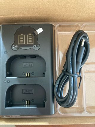 Caricatore doppio per batterie LP-E6 e LP-E6P. Permette di caricare due batterie contemporaneamente. Compatibile con Canon EOS R5 Mark II, R5, R62, R6, R7 e fotocamere con batterie Serie LP-E6. Include cavo di connessione. Completamente nuovo.