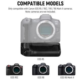 Questo manico della batteria è progettato per le fotocamere Canon EOS R5, R5C, R6 e R6 Mark II, offrendo una presa sicura e comoda per una fotografia verticale stabile. Permette di raddoppiare la durata della batteria ospitando due batterie LP-E6N/LP-E6NH (non incluse). Include controlli essenziali come l'otturatore e il dial di regolazione, facilitando l'uso in verticale. Dispone di un filetto da 1/4" per il montaggio su treppiedi e altri accessori.