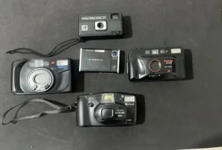 Set di cinque fotocamere di diverse marche. - Fotocamera Kodak Pocket. - Fotocamera Fujifilm FinePix. - Fotocamera Nikon AF. - Fotocamera Premier PC-3000. - Fotocamera Fuji DL/SUPER.