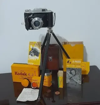 Set di accessori fotografici vintage Kodak. - Macchina fotografica a soffietto Kodak 6,3 Modèle 21. - Custodia in pelle marrone. - Scatole originali per accessori. - Filtri Kodak (rosso, perla). - Treppiede nero pieghevole.