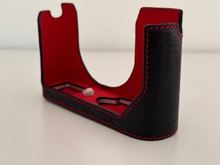 Fondello in pelle per Leica Q / Q2. Interno rosso, cuciture rosse e chiusura magnetica con due porte per batteria e scheda. Include vite in ottone. Marca non identificata (non è un fondello originale Leica, ma ha un logo). Nuovo e mai usato.