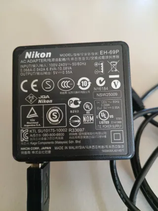 Alimentatore di rete per fotocamere Nikon. - Modello: EH-69P - Input: 100-240V ~ 50/60Hz 0.28A-0.14A - Output: 5V 2.5A