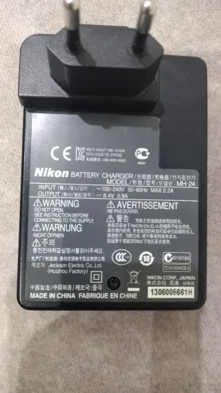 Caricabatterie originale per fotocamere Nikon. Modello MH-24. Nuovo, mai utilizzato, aperto solo per le foto. Include il cavo di ricarica. Ricarica le batterie Nikon EN-EL14 e EN-EL14a. Compatibile con: Nikon D3100, D3200, D3300, D3400, D3500, D5100, D5200, D5300, D5500, D5600. COOLPIX: P7000, P7100, P7700, P7800.