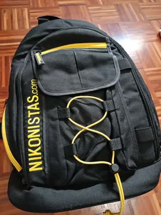 Zaino nero con dettagli in giallo, ideale per trasportare attrezzatura fotografica. - Scomparto principale imbottito. - Tasca frontale con chiusura. - Cinghie regolabili.