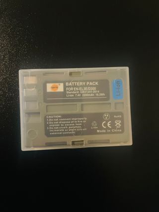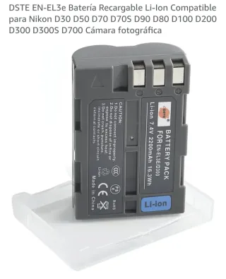 Batteria ricaricabile Li-Ion EN-EL3e compatibile con fotocamere Nikon. Nuova, senza utilizzo. Capacità: 2200mAh. Tipo: Li-Ion. Modello: EN-EL3e compatibile. Compatibile con: Nikon D30, D50, D70, D70S, D90, D80, D100, D200, D300, D300S, D700. Ideale come batteria di riserva o sostituzione. Pronta all'uso.