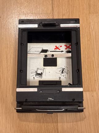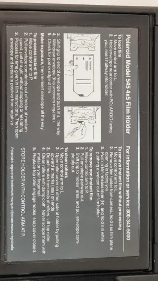 Supporto Polaroid per fotocamere grande formato, modello 545. Progettato per pellicola 4x5 pollici. Include istruzioni per il caricamento e il processo. Consente l'uso di pellicola istantanea e non istantanea. Guarda il mio profilo, ho molte altre cose interessanti...
