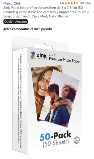 Confezione da 50 fogli di carta fotografica ZINK® Zero Ink® con retro adesivo. - Dimensioni: 2 x 3 - Compatibile con Polaroid Zip, Snap, Snap Touch e fotocamere Mint.