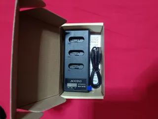 Caricatore per batterie EN-EL15, ideale per fotocamere. - Design compatto e portatile. - Due slot per la ricarica simultanea. - Display LCD per monitorare lo stato di carica. - Cavo USB incluso per l'alimentazione.