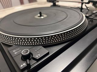 Giradischi professionale Audio-Technica con finitura argentata e nera. Ideale per DJ e amanti della musica. Disco rotante ad alta precisione. Braccio di lettura bilanciato. Controllo del pitch regolabile. Prezzo fisso.