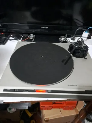 Giradischi Pioneer... il coperchio funziona perfettamente con le sue cerniere e ha pochi graffi. Le uniche due piccole cose di manutenzione da fare sono cambiare l'ago e controllare la cinghia di gomma, che si è staccata dal giradischi. Funziona... funziona.