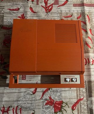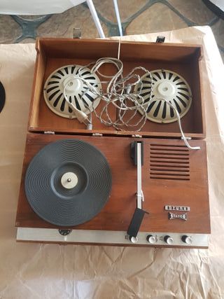 Attrezzatura audio vintage con giradischi e radio. Design portatile con maniglia. Include due altoparlanti esterni. Lettore di cassette integrato. Con segni di scolorimento. Il giradischi funziona nonostante il braccio sia in riparazione. Il lettore di cassette gira alla velocità corretta ma il testine richiede attenzione. La radio funziona perfettamente. Manca il coperchio del vano batteria. Ha una connessione a 220 V nel vano batteria.