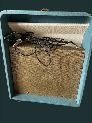 Giradischi portatile con un design retrò e funzionale, ideale per gli amanti della musica e del collezionismo. Prodotto nel 1962. Funziona perfettamente. Design tipo valigia per un facile trasporto. Finitura esterna in toni di blu e beige. Manca solo una zampa.