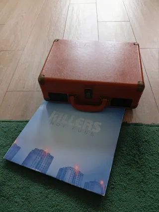 Tocadiscos portatile con design da valigetta vintage. Finitura esterna marrone. Include custodia in vinile Hot Fuss dei The Killers.