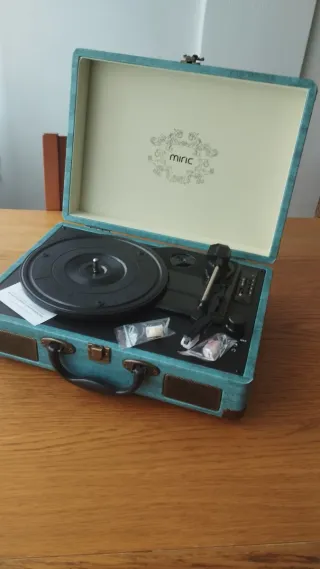 🎵 Giradischi portatile Trynnay con Bluetooth 💽 Lettore di vinile a 3 velocità (33, 45 e 78 RPM) 🔊 Altoparlanti stereo integrati con suono migliorato 📡 Connettività Bluetooth per riprodurre musica dal tuo cellulare 🎧 Uscita RCA e ingresso ausiliario per massima compatibilità 🧳 Design vintage in valigetta con finitura in pelle sintetica nera 🎶 Ideale per gli amanti del suono classico e della decorazione retrò 📦 In perfette condizioni e nella sua scatola originale 😊 Domande? Scrivici! 💸 Prezzo negoziabile · 🚚 Spedizione gratuita in tutta la Spagna!