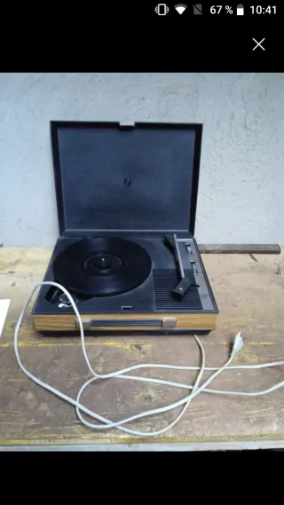 Giradischi portatile con un design classico e funzionale. Ideale per ascoltare i tuoi vinili. Della marca Fidelity. Funziona perfettamente. Ha il gancio del coperchio anteriore rotto ma non impedisce il funzionamento, come si può vedere nella terza foto. La spedizione è inclusa.